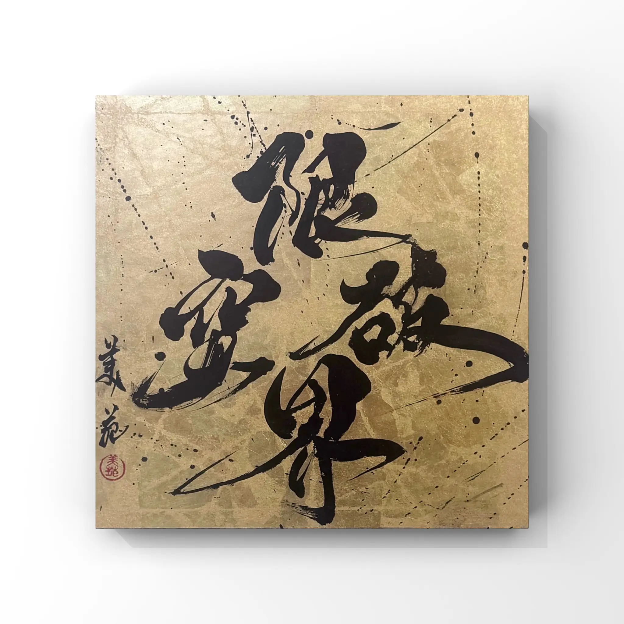 箔のもつ美しさや上品さに、書道ならではの力強さや繊細さを重ねることで、華やかさの中にも気品を感じさせる表現が生まれます。光の角度や時の経過によって色合いが変化していく様子は、まるで箔もまた書と同じように「生きている」かのようです。